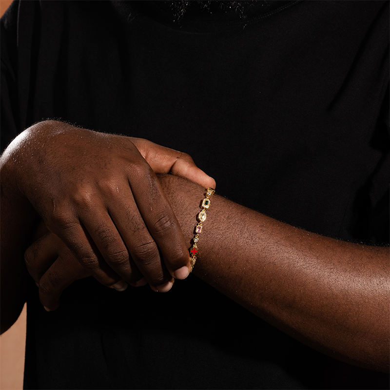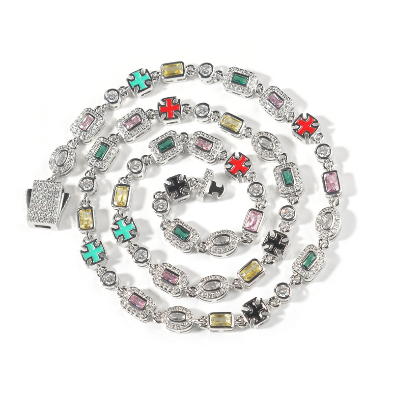 UNIQUE LINK PATTERN - Alternating between rectangular gems, round stones, and enameled cross motifs, this design offers a distinctive and fashionable statement piece that is both modern and meaningful.