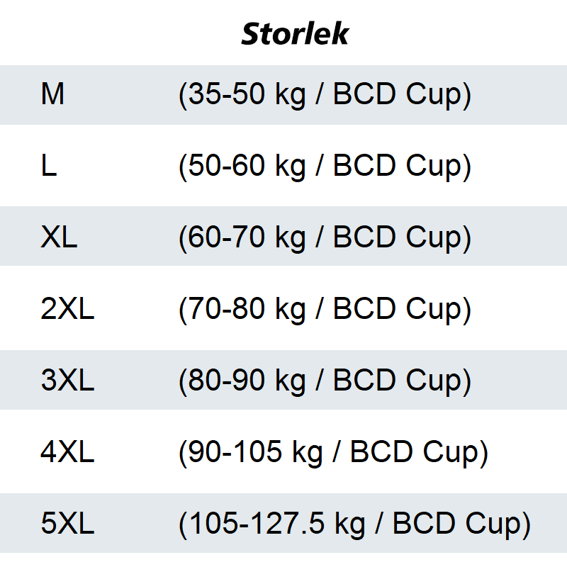 Größe: M (35-50kg/BCD Cup), L (50-60kg/BCD Cup), XL (60-70kg/BCD Cup), 2XL (70-80kg/BCD Cup), 3XL (80-90kg/BCD Cup), 4XL (90-105kg/BCD Cup), 5XL (105-127.5kg/BCD Cup)
